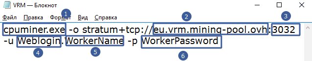 cpuminer-opt.exe -a [алгоритм] -o stratum+tcp://[адрес пула]:[порт] -u [ваш_адрес_кошелька].[имя_воркера] -p [пароль]