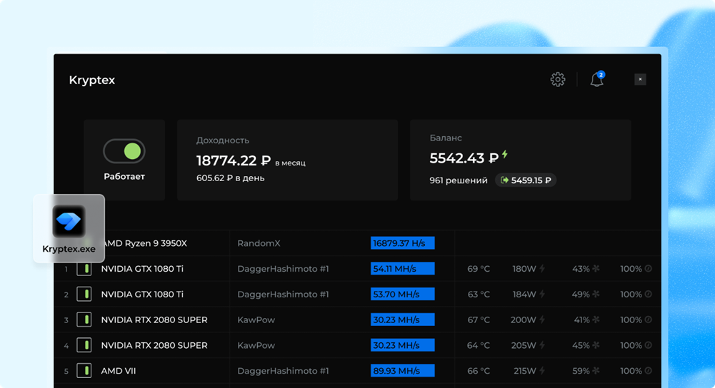 Kryptex Miner — это бесплатная программа для майнинга криптовалют, которая позволяет пользователям зарабатывать на вычислительной мощности их компьютеров. Приложение автоматически выбирает наиболее прибыльные монеты для майнинга, обеспечивая оптимальный доход без необходимости глубоких технических знаний.